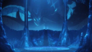When the final battle took place at the Gran Crevasse, a fusion of Nawabari and the other serpent burst through the walls of the facility, destroying a FRANXX in the process, and the Klaxosaur Princess proceeds to attack Dr. FRANXX and forces Hiro to link with her in Strelizia. However, Strelizia becomes infected by a virus implanted by Papa, setting off a detonation countdown. Nawabari's fusion offers to help Zero Two reach the core of Star Entity to save the two and she parts ways with Dr. FRANXX. They pass through the narrow tunnel leading to the core and Nawabari dies in the process. Zero Two thanks Nawabari for helping her as life leaves his fragments.