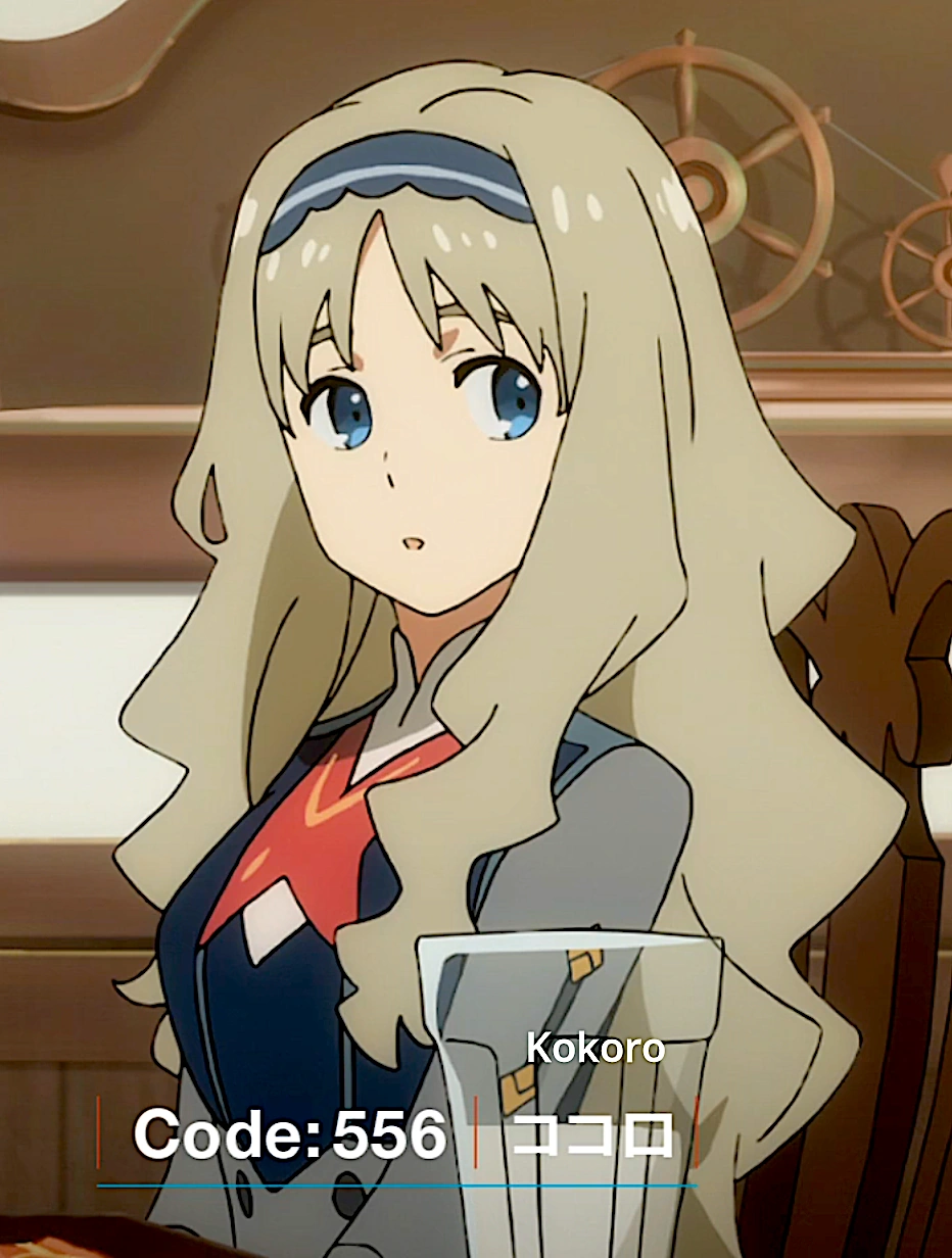 Kokoro finds her a "strange person and wonders if she likes sweets". Kokoro is very quiet and reserved, but is fond of Zero Two and finds her presence reassuring. Zero Two rescues her, Ichigo (Delphinium), and Miku (Argentea) during their mission into the underground. After the retrieval of the deactivated Strelizia, she is visibly worried when she sees Zero Two emerge from the FRANXX but not Mitsuru, who was at a near-death state in the cockpit. She emulates Zero Two when feeding Futoshi in the same manner Zero Two feeds Hiro. Kokoro and Miku are excited to see that Zero Two and Hiro are now part of Squad 13. Kokoro expresses that it's reassuring since Zero Two has saved the squad in every mission.