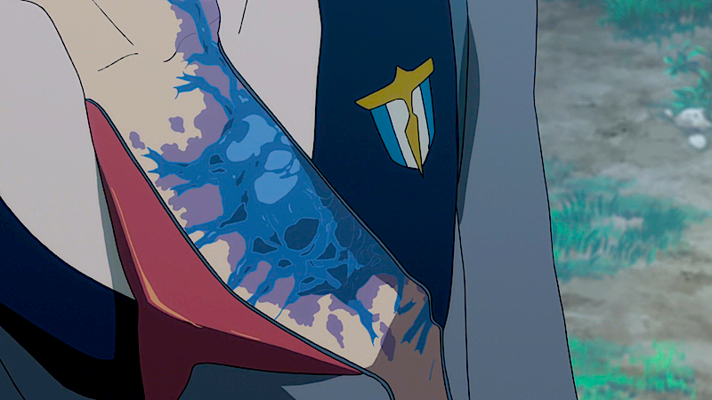 The next morning, Hiro goes outside and approaches a soaked Zero Two by the lake. It is implied she spent the rest of the night out in the rain. Zero Two tells him that everything smells nice after it rains. Zero Two reminisces of the time they first met. Hiro thanks her, stating that the reason he's still there is because of her and that she gave him the chance to pilot a FRANXX. Zero Two unzips his uniform revealing a blue tumor. Zero Two asks him if it hurts and if he wants to walk away from being her partner. Hiro admits that it hurts, but confirms that he'll ride with her. Zero Two smiles and begins to joyfully laugh and dance, having found someone willing to give his life for her.