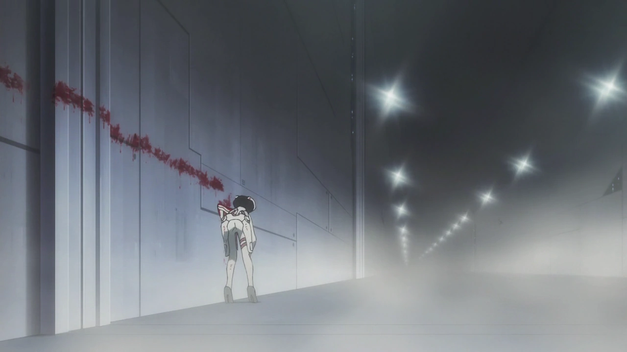 Hiro takes care of Zero Two while she is in a catatonic state and is confused when mysterious injuries begin showing up on her body. Hiro finds the last page of her story blank and he realizes she deliberately left it blank because she foresaw they would part ways one day. She starts wondering around from her room and goes outside, looking at the sky. Hiro vows to be with her and, when his horns make contact with her, he realizes her mind is with Strelizia and she is actually fighting VIRM in Mars’ orbit system in space.