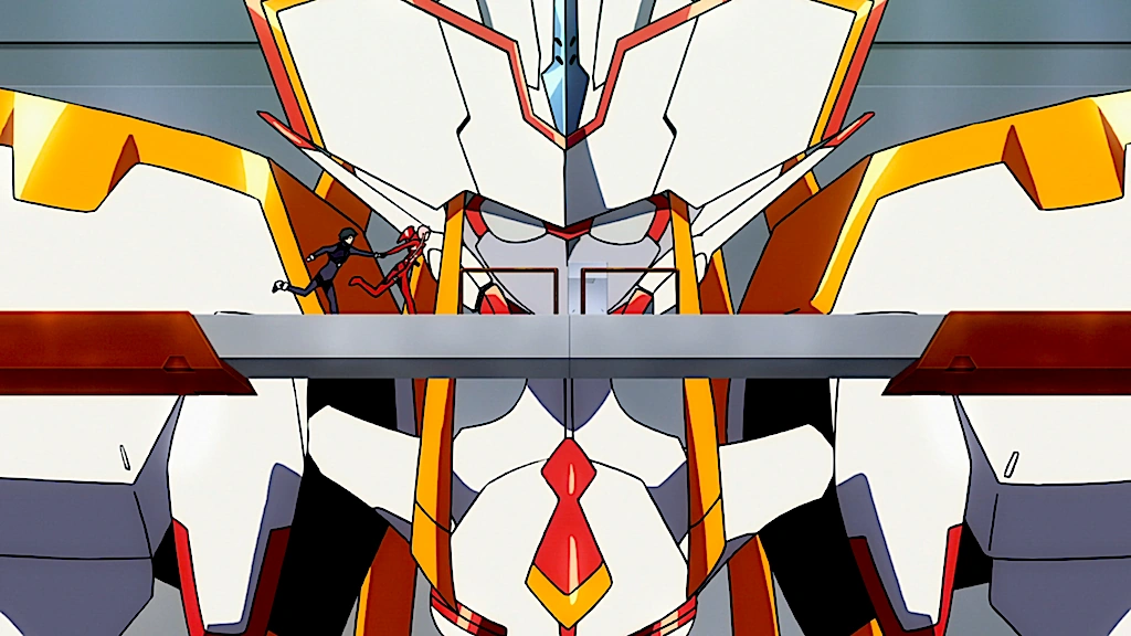 Hiro is able to board Strelizia and mentally meets with Zero Two, whose mind is filled with images of her storybook. She says they can’t be together because she is not human and she is fine with being alone. Hiro disagrees and offers her his hand, vowing to never leave her. They reconcile and reconnect, causing Strelizia to evolve into the Strelizia True Apus. They then decide to travel through a warp gate in order to eliminate the VIRM and put an end to the war for good.