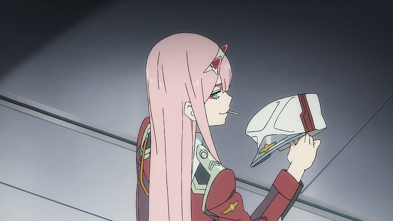 After Ichigo's subsequent failure to properly pilot with Hiro, Zero Two is shown flipping her hair in the wind and triumphantly eating her lollipop while leaving the training grounds.