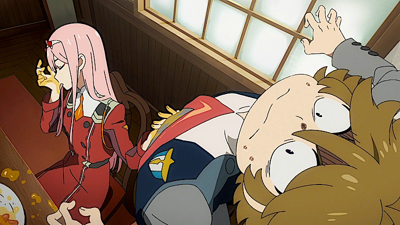 Zero Two is seen waiting for Hiro so that they can have breakfast together. She insists on sitting beside Hiro at Futoshi's expense, thereby forcing Futoshi to sit at the girl's table by Kokoro's invitation. While Ichigo gives the morning prayer, Zero Two is hard at work slathering her entire breakfast (and Hiro's) with honey. She then begins feeding Hiro to the disgust of Goro and the jealousy of Zorome. Futoshi and Kokoro imitate them while Ichigo silently ponders into her teacup.