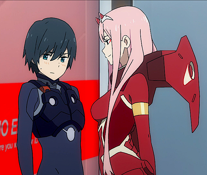 Zero Two was enthralled by Hiro immediately after seeing him. They first meet when she was skinny dipping in Cerasus' lake. Being pleased with his taste and him not being afraid of her horns, she proposes that he become her "darling". Though they are briefly separated, they reunite after her partner dies and Hiro acts as his replacement. Their relationship becomes stronger with them both finding someone with whom they can successfully pilot with; being even able to pilot Strelizia in its iron maiden form.